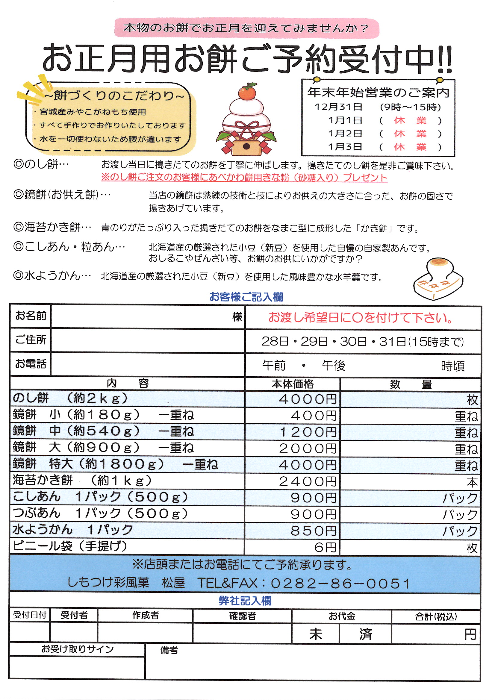 宮城産みやこがねもち使用、すべて手作りでお作りします。のし餅・鏡餅・海苔かき餅、こし/つぶあんや水ようかんもご用意。お渡しは12/28~31(31日は15時まで)。※1/1~3休業。