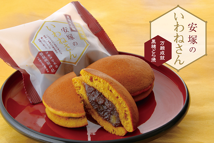 地元安塚の氏神様「磐裂根裂神社」通称いわねさん。そこから湧き出る長寿の神水を使用し、皆様の万願成就を願いおつくりした黒糖どら焼きです。